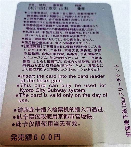 京都市地鐵一日券(地下鉄1日乗車券)是京都較冷門的交通票券,