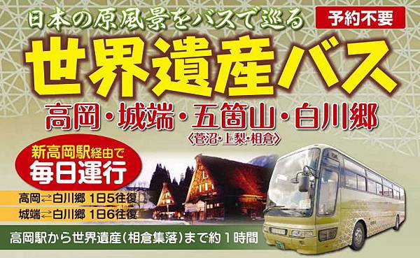 除了從高山出發,還可以從高岡站/新高岡站搭乘「世界遺產巴士」直達白川鄉,車程約兩小時。